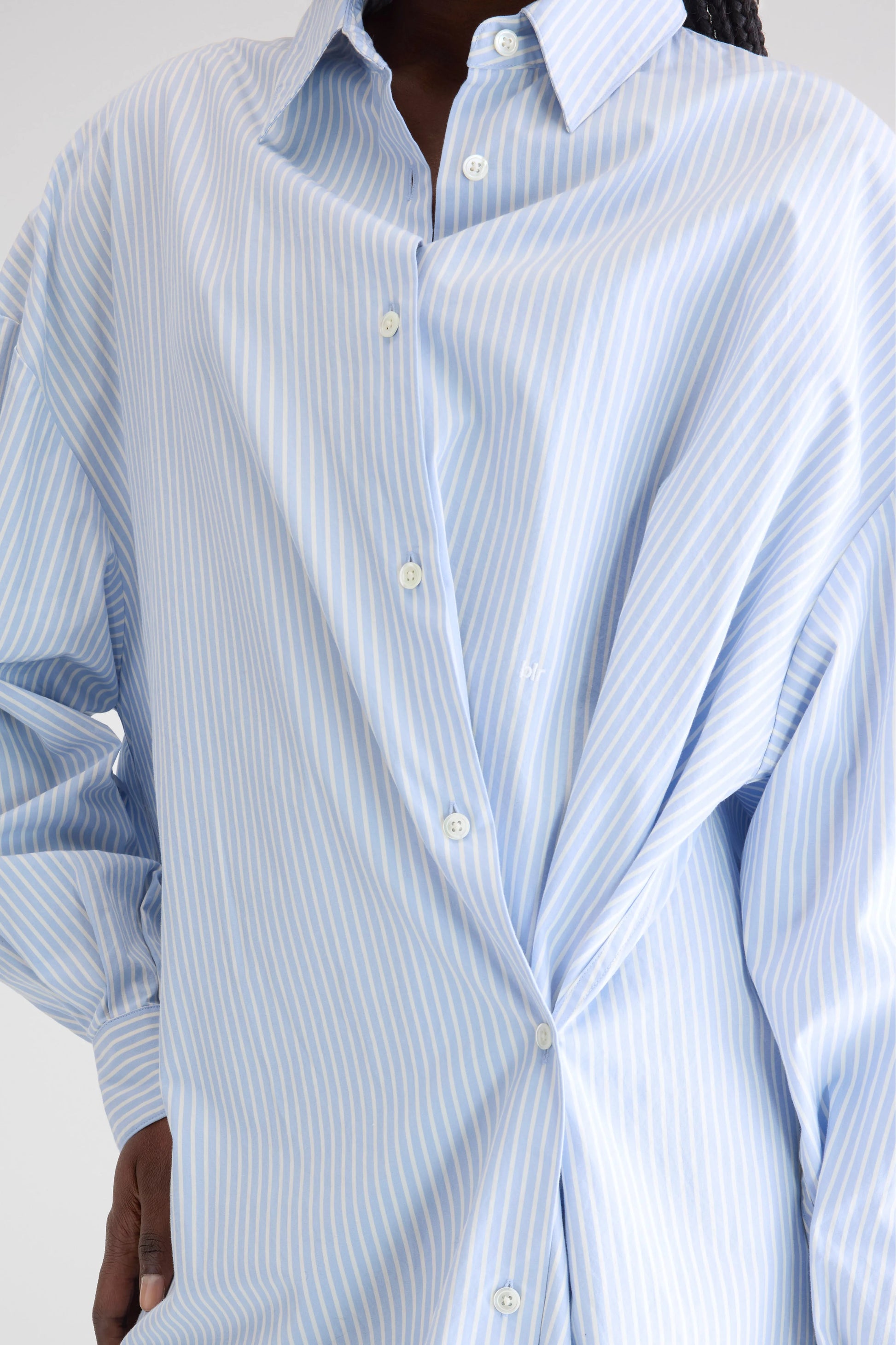 Oversized light blue and white striped shirt dress with an adjustable button detailing for a customizable fit.