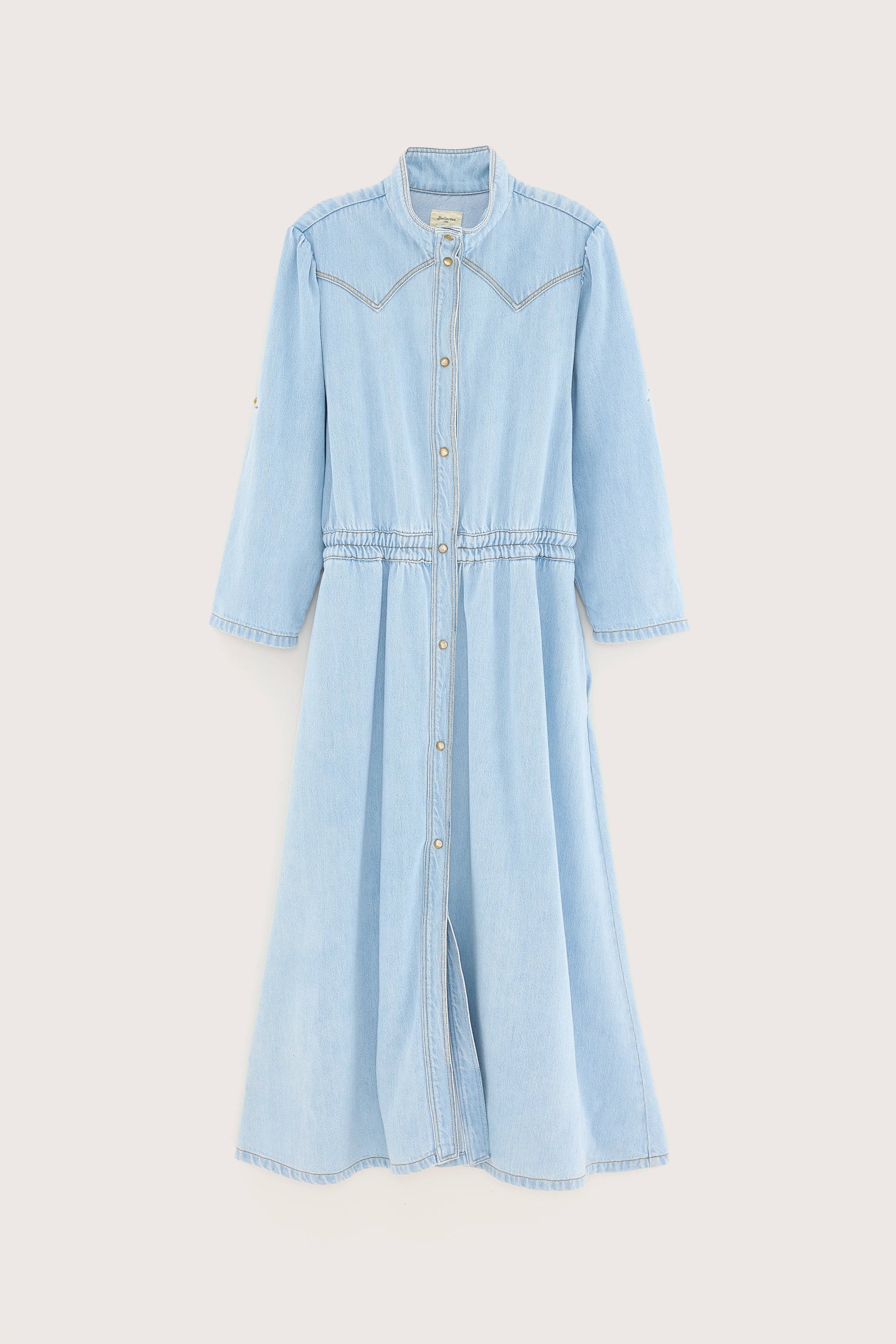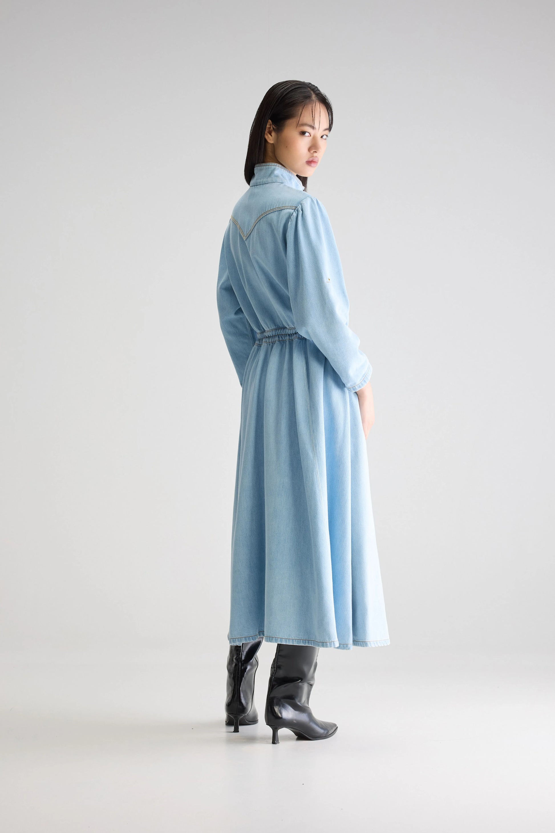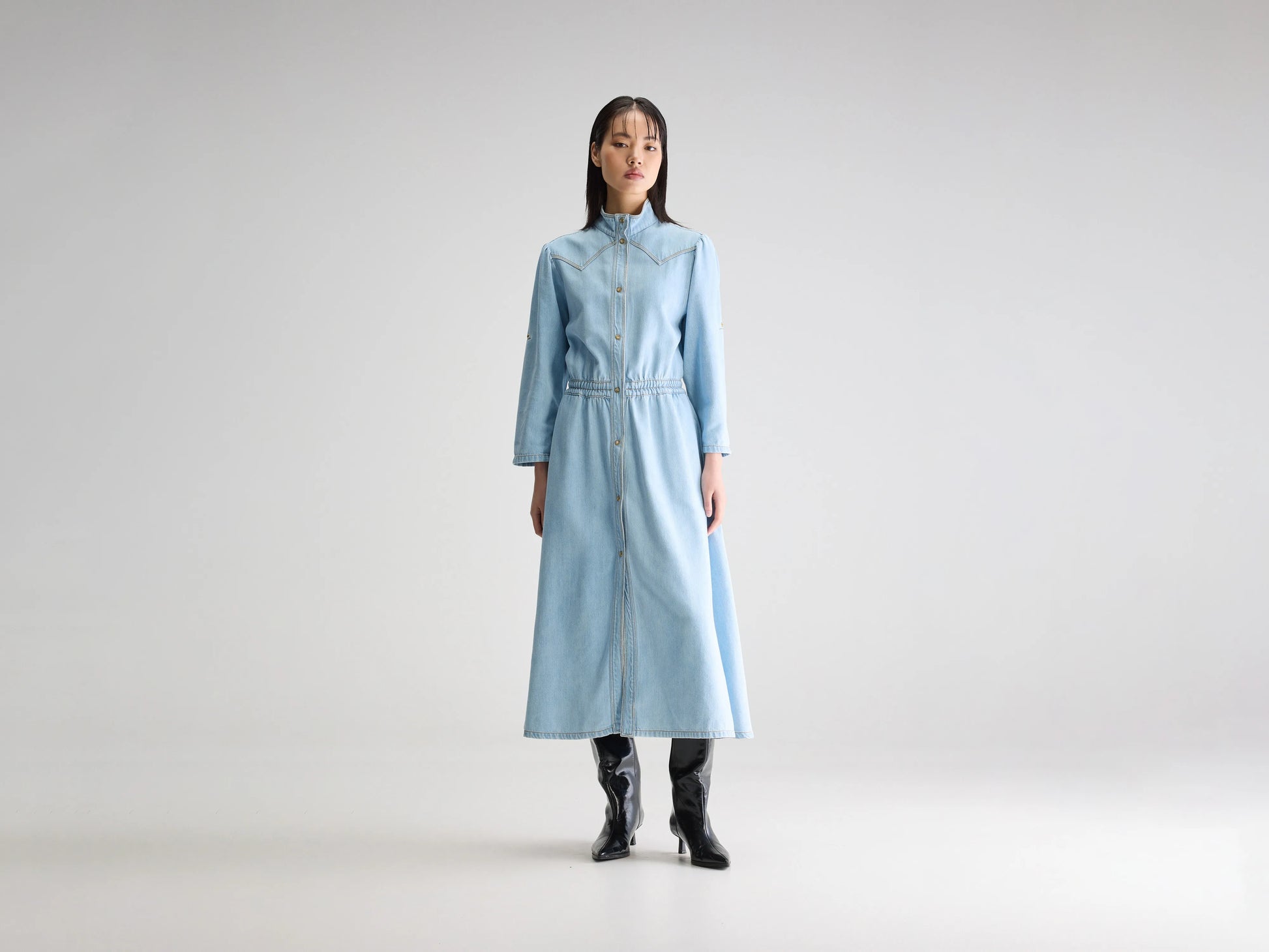 Regular midi dress with western-inspired yoke and a raised collar, long sleeves that can be adapted with a roll-strap and a snap-button front, made from light blue denim with contrasting stitches.