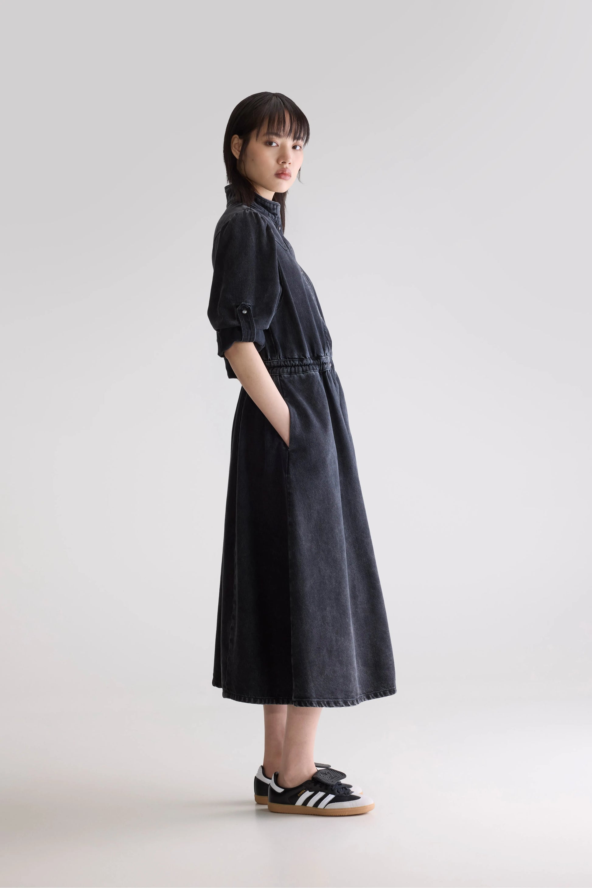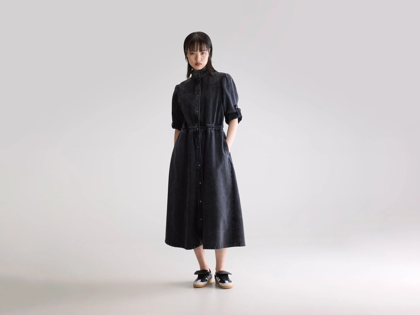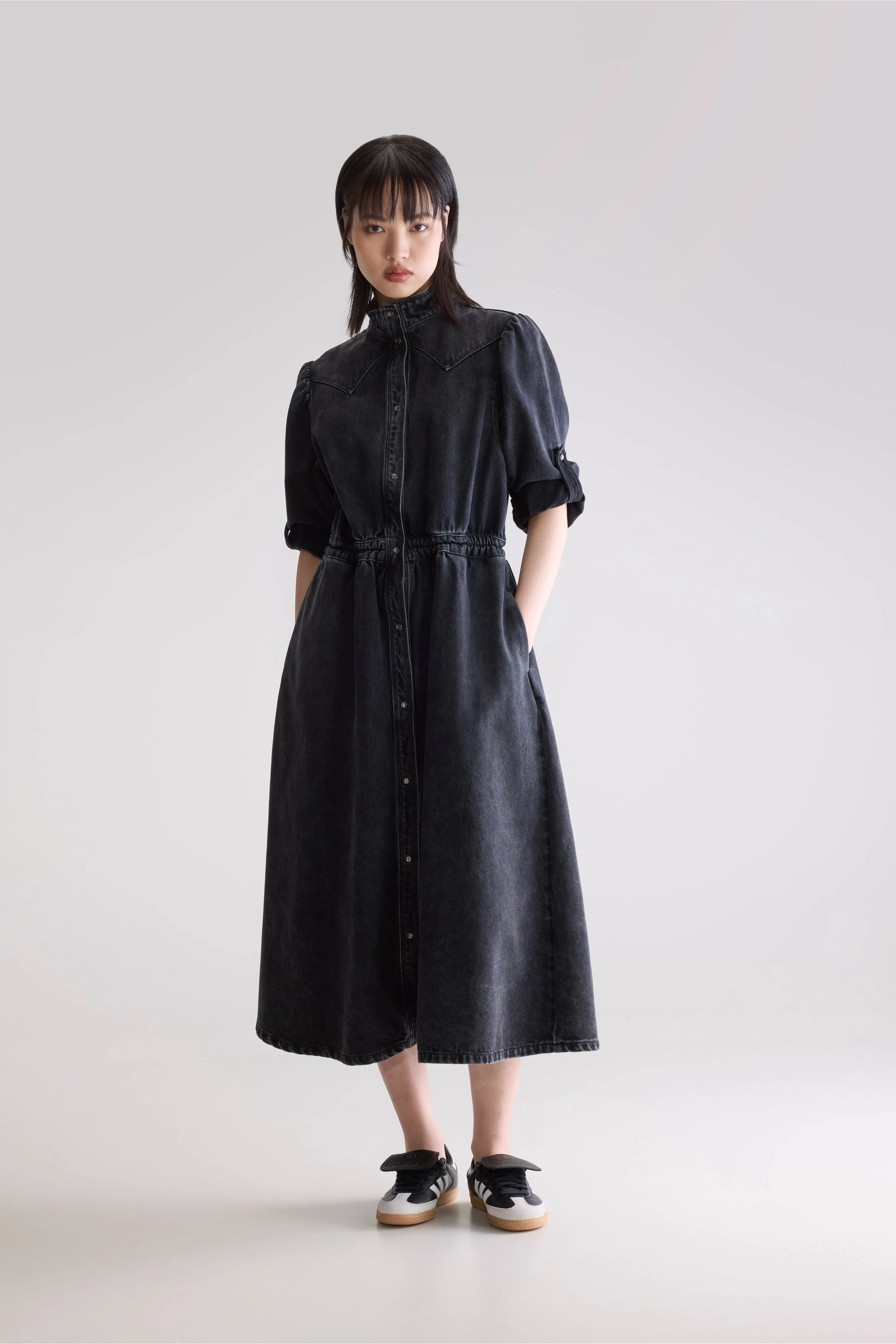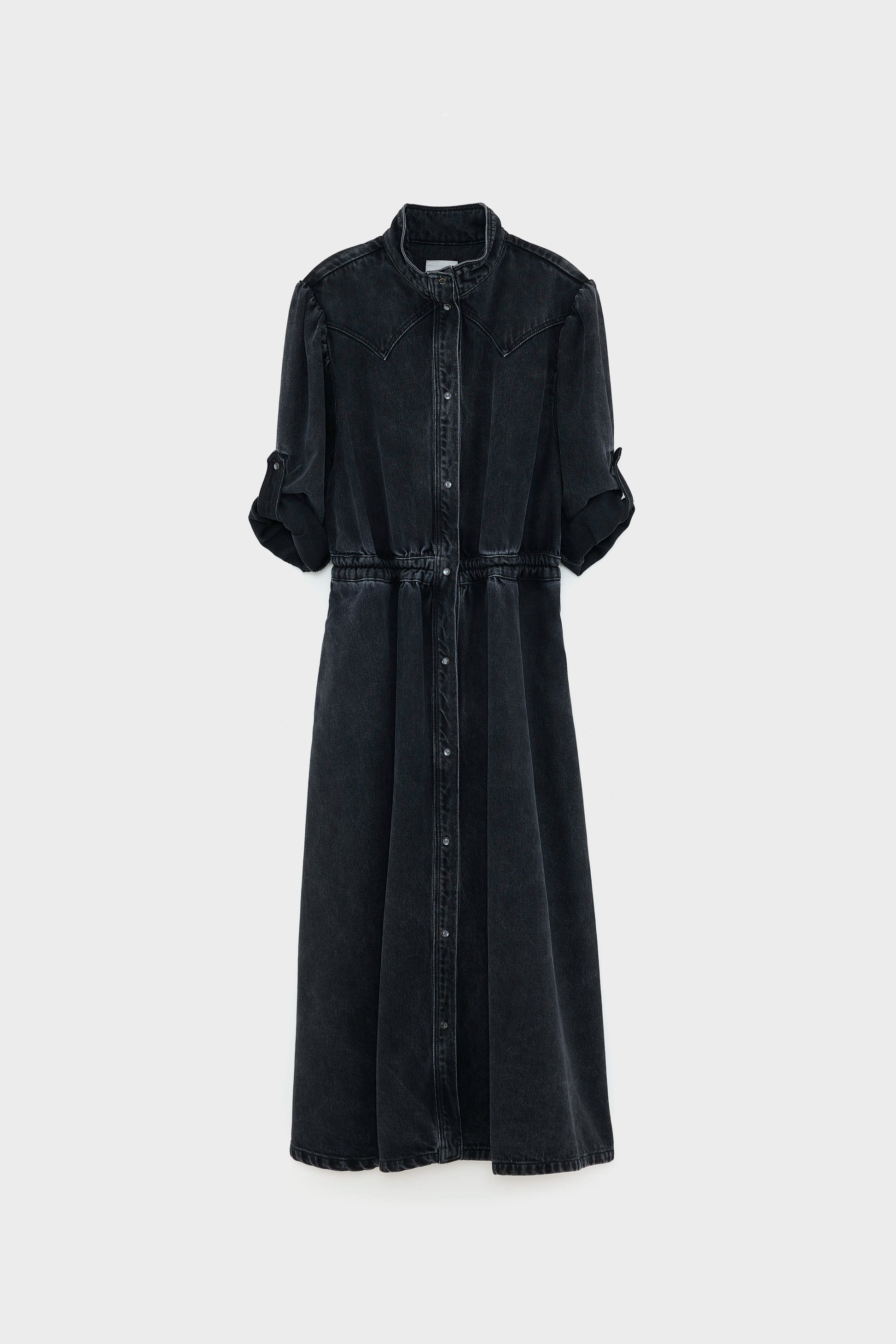 Western inspired denim midi dress with a raised collar, long sleeves that can be adapted with a roll-strap and a snap-button front, made from cotton denim in vintage black.