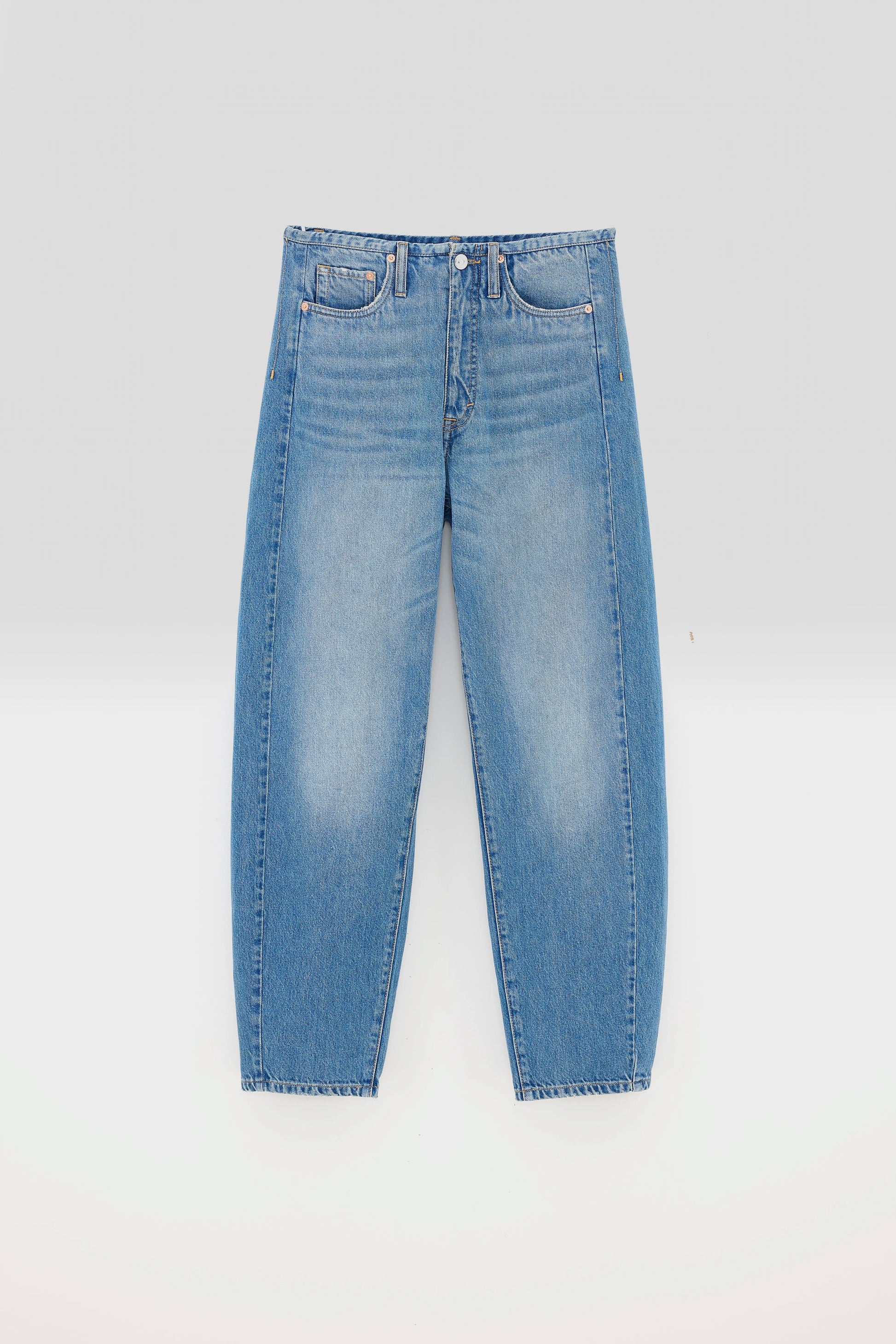 Loose-fit, low-rise jeans in a classic vintage blue wash, featuring wide legs, a cut-off waist design, and exposed side seams.