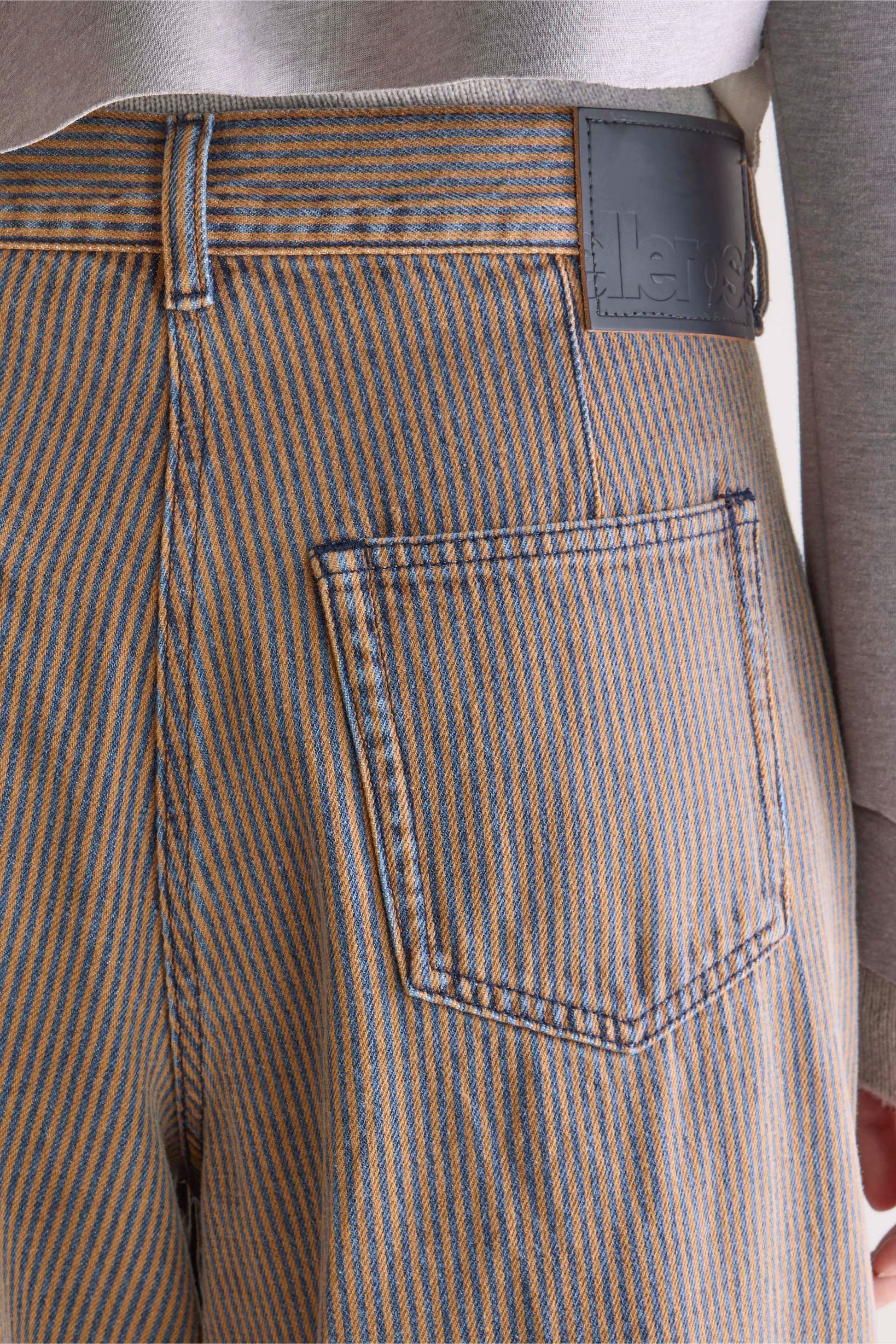 Regular-fit, mid-rise jeans with pleated front, featuring super-wide legs and crafted from thin striped cotton denim in mid-blue and mustard yellow.