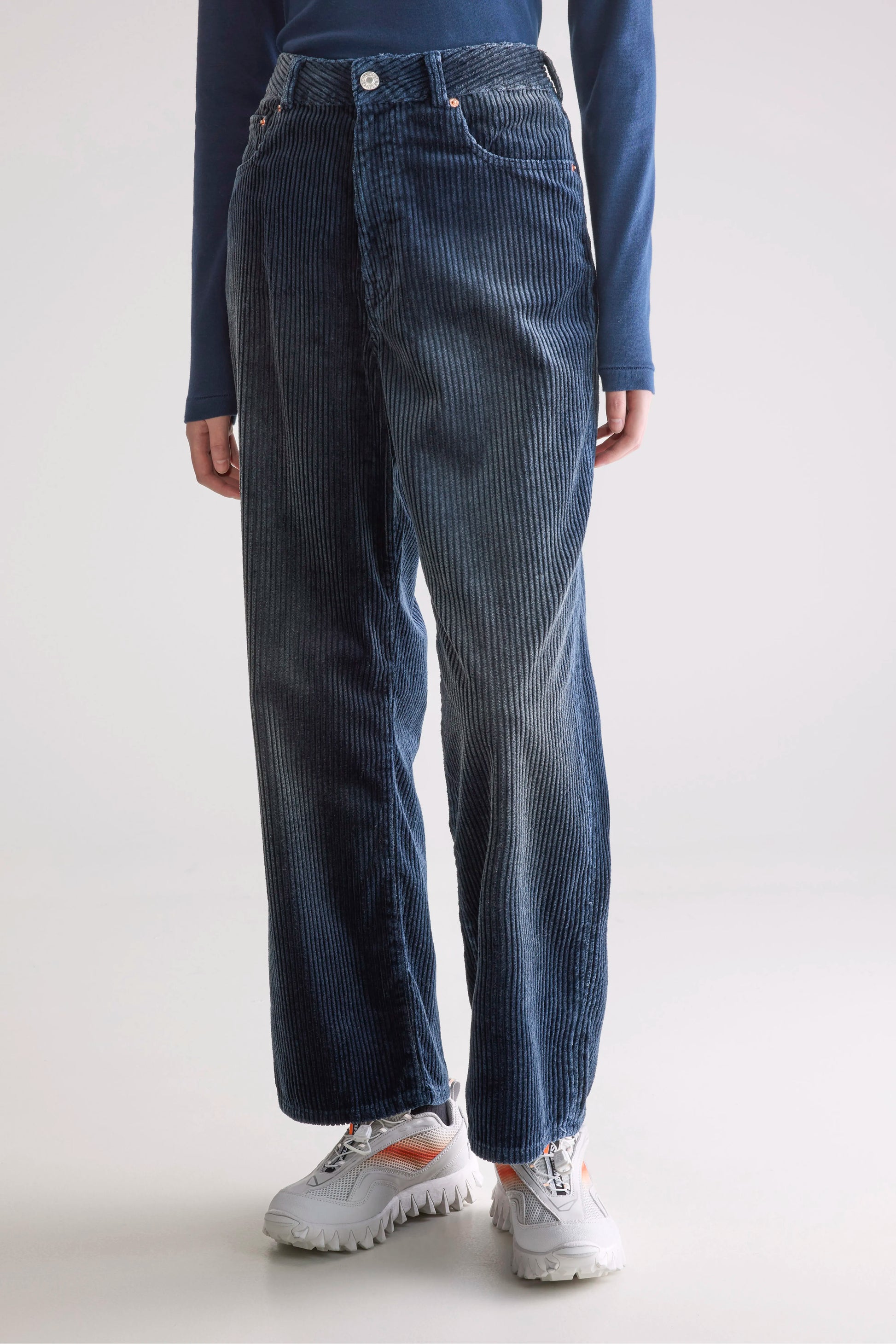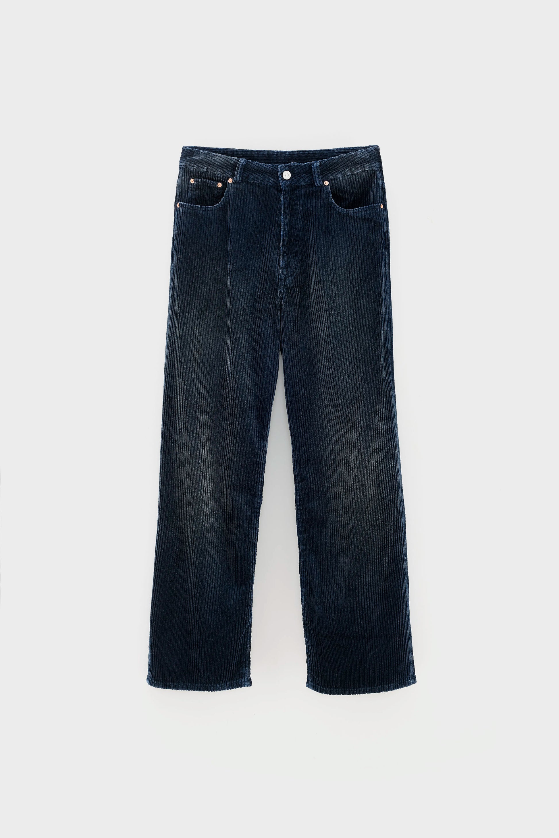 Hip-hugging, super high-rise jeans with wide legs made from black-blue corduroy cotton.