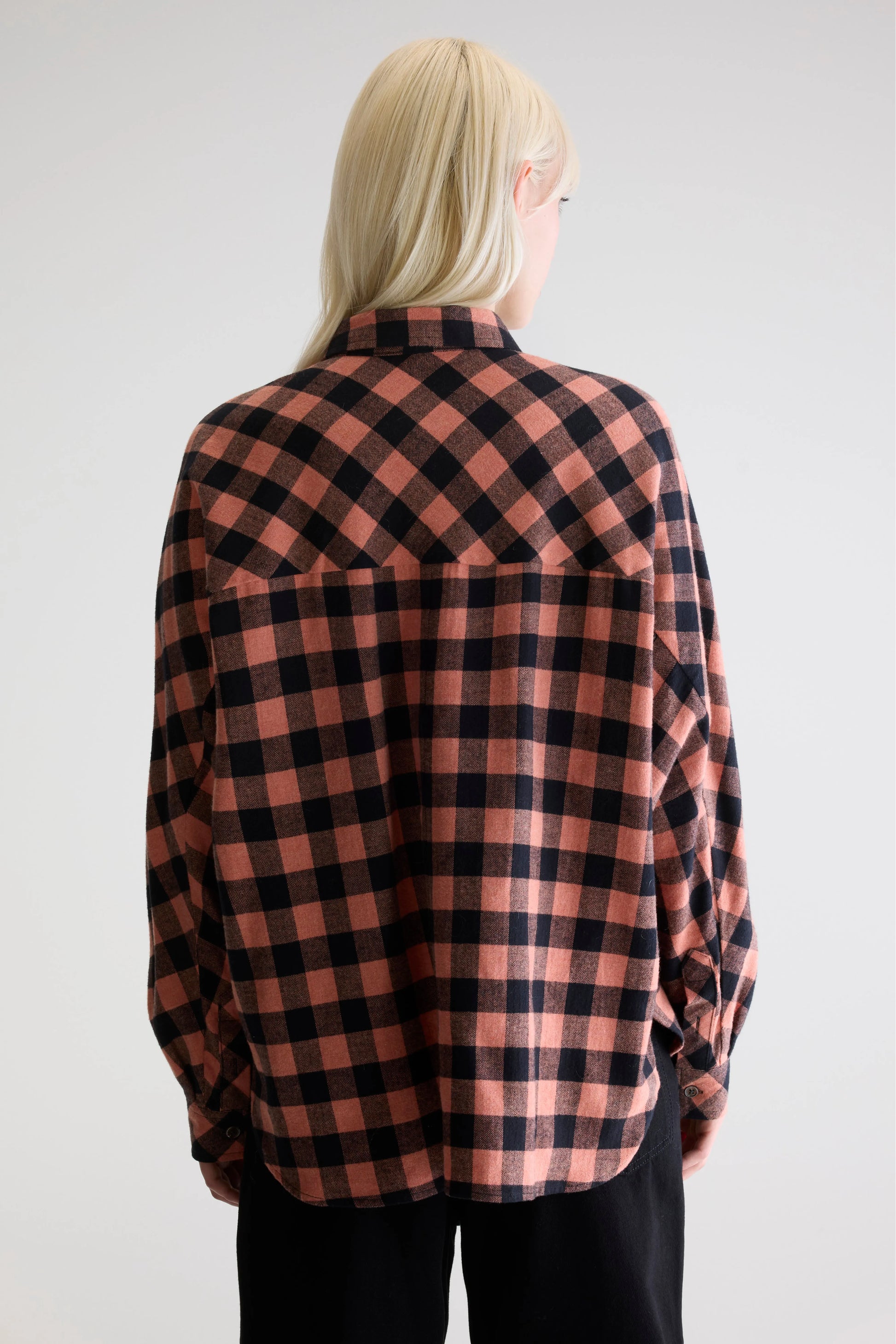 Oversized checkered shirt in orange and black, with a chest pocket.
