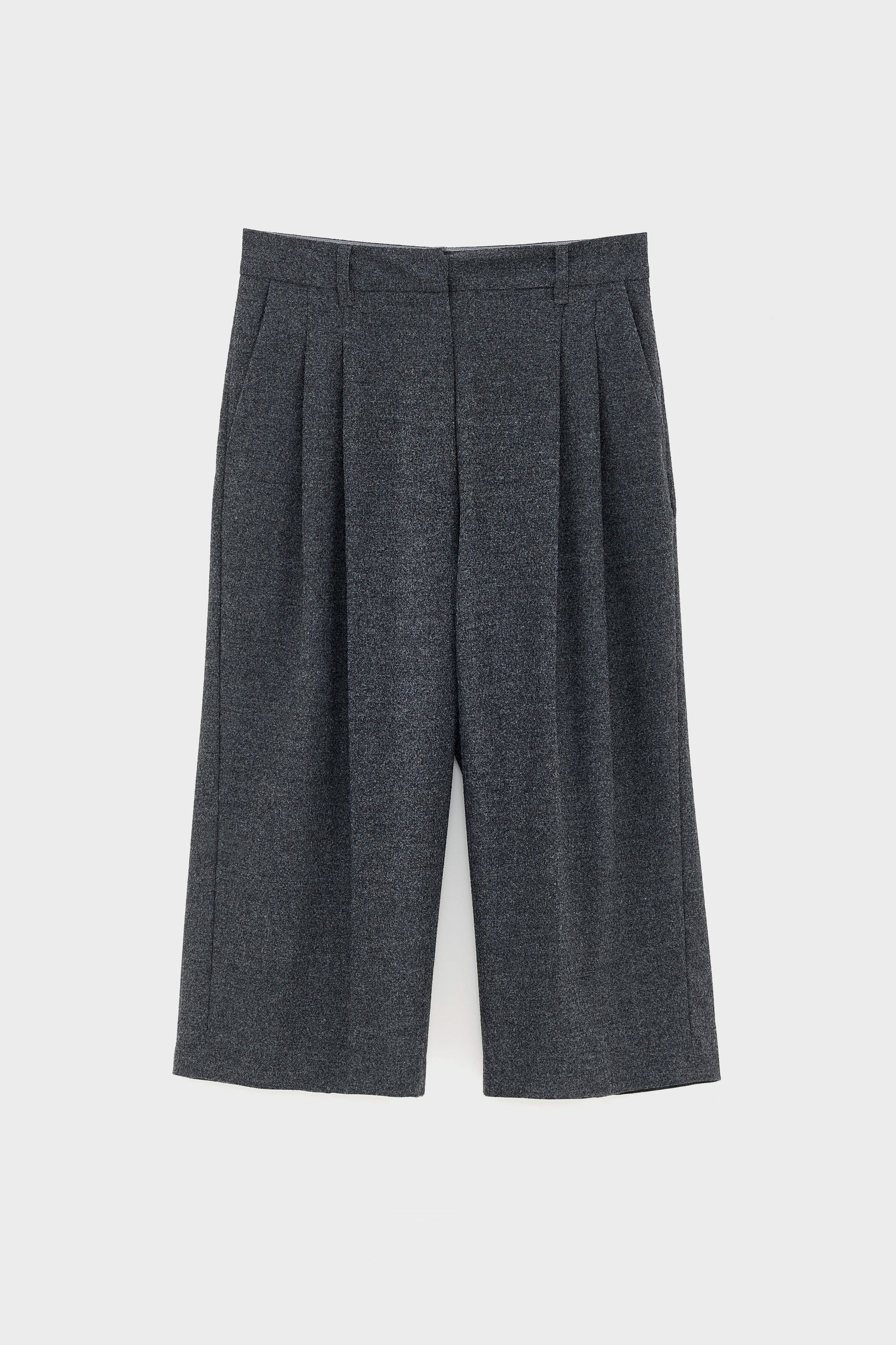 Tailored Bermuda shorts in charcoal grey flannel-style with pleated details and a straight-leg cut.