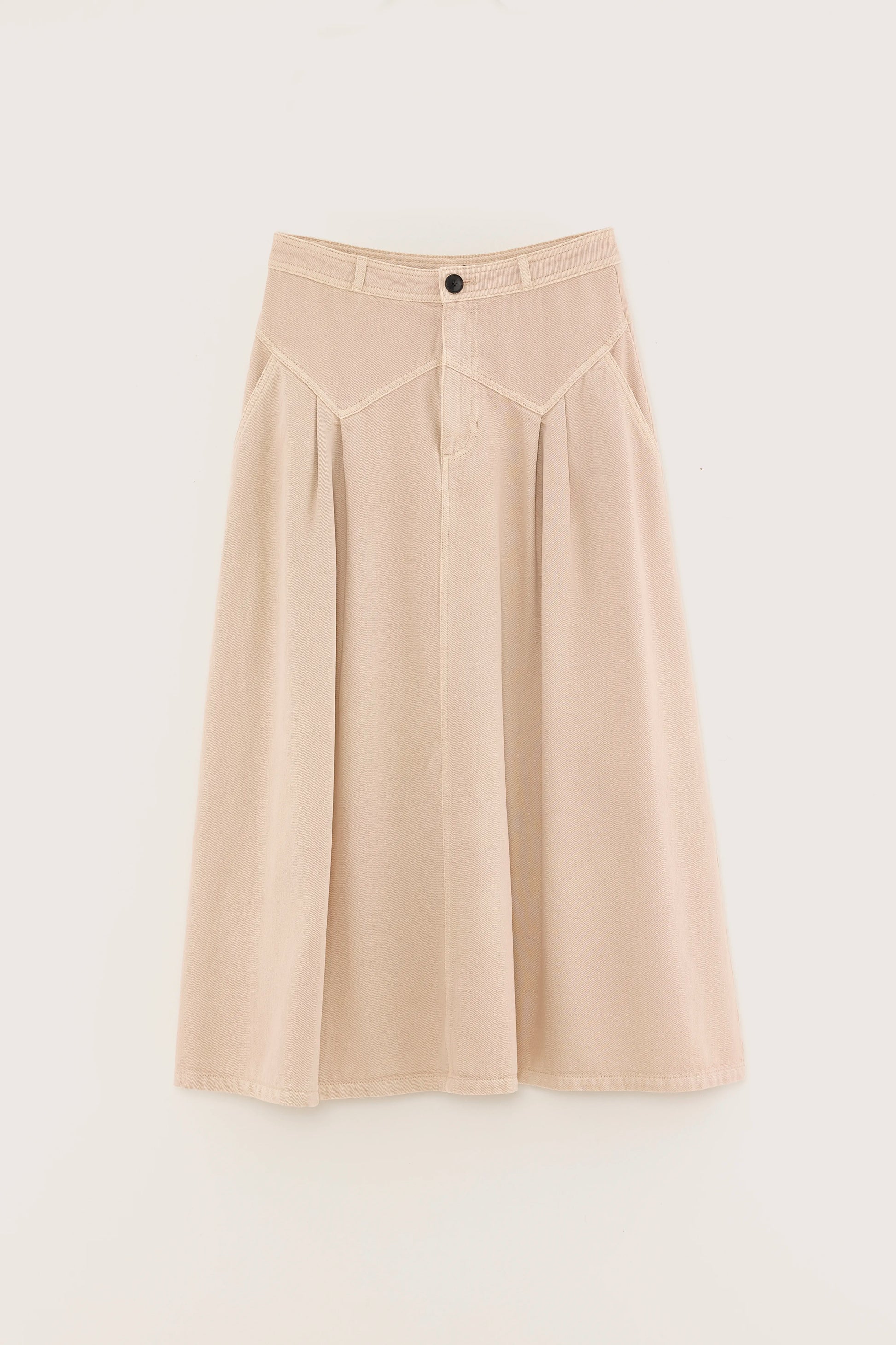 Flared mid skirt with Western-inspired details on the waist and front pleats made from pastel lilac cotton twill.