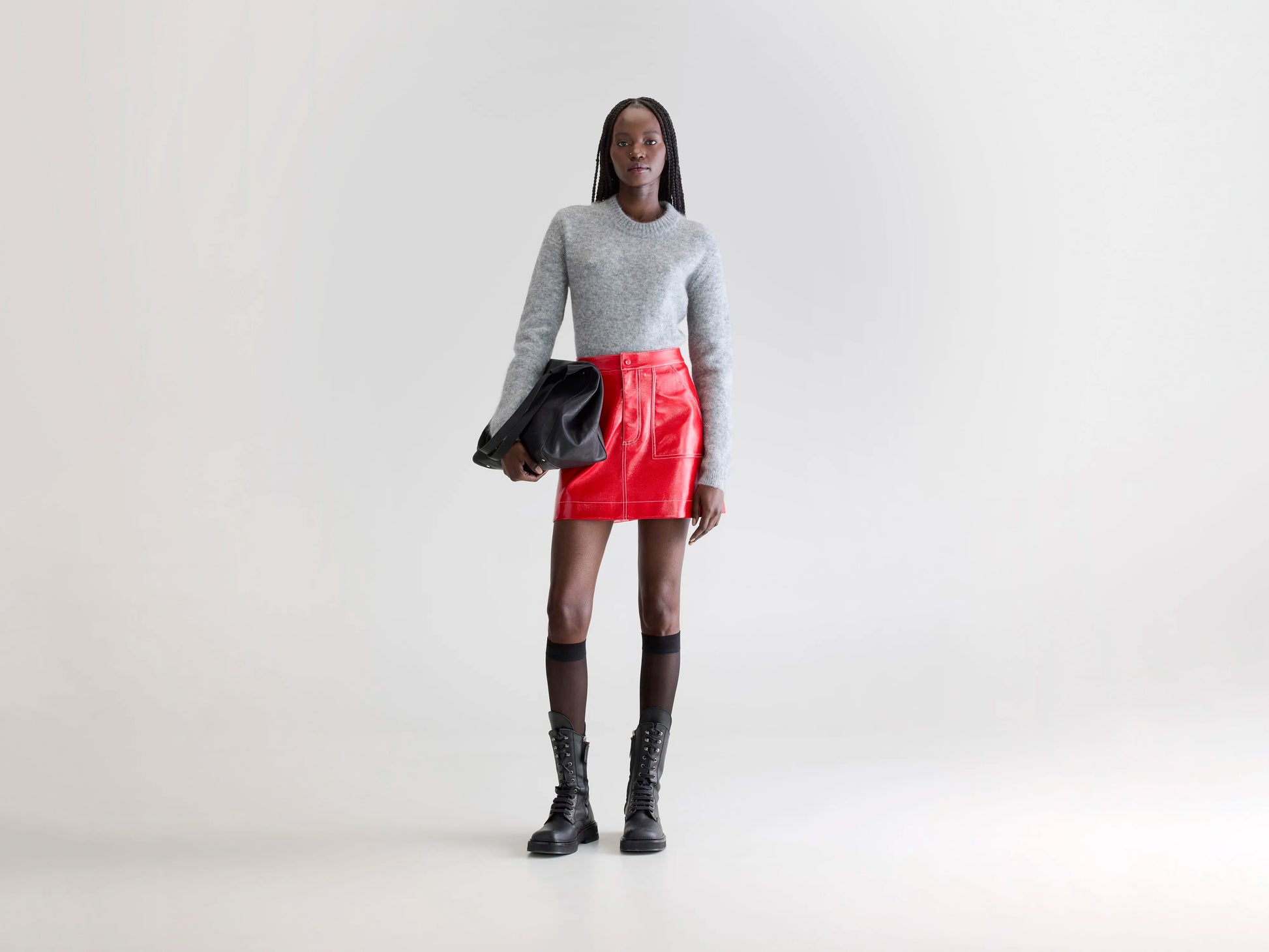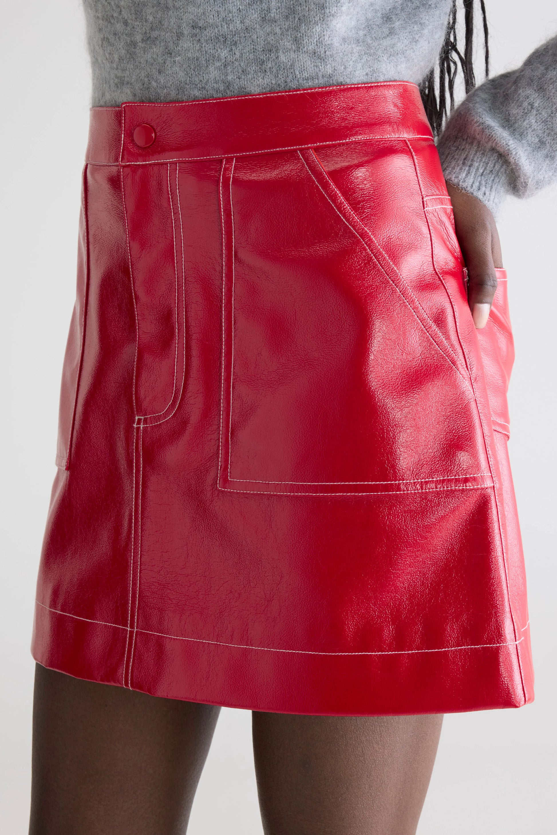 Faux-leather mini skirt with an A-line shape and side patch pockets made from vinyl-like fabric in crimsom red.