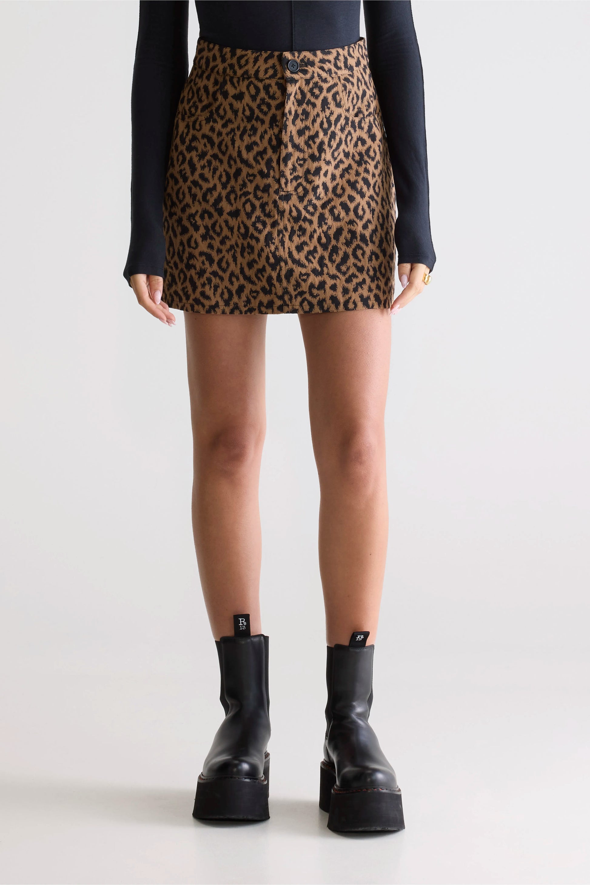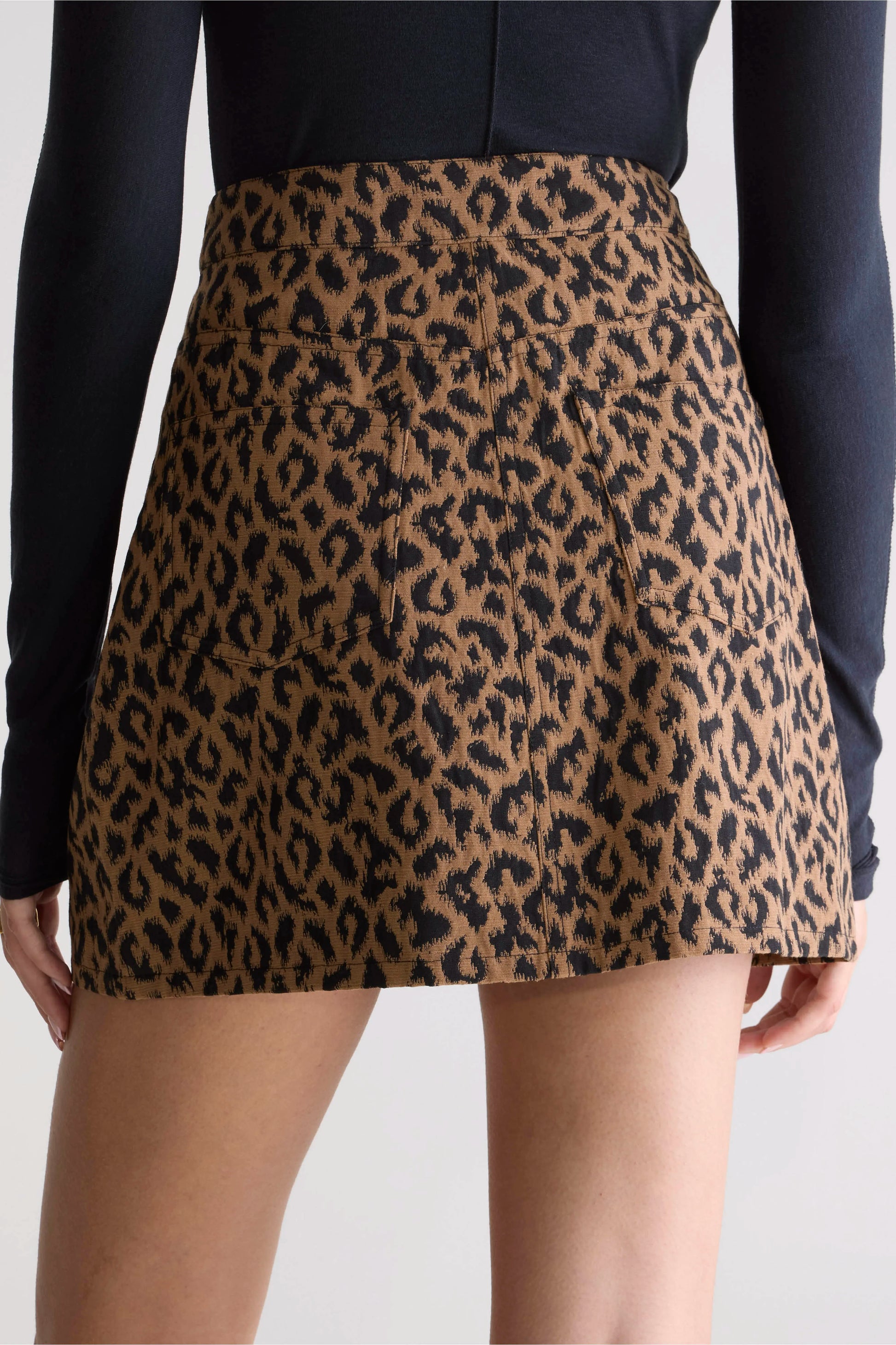 Faux leather mini skirt with an A-line shape and 5-pocket style made from vinyl-like fabric in leopard print.