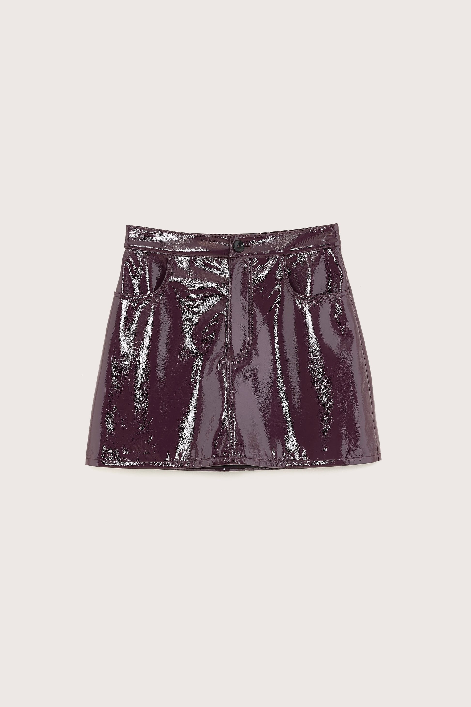 Fake-leather mini skirt with an A-line shape and 5-pocket style made from vinyl-like fabric in burgundy.