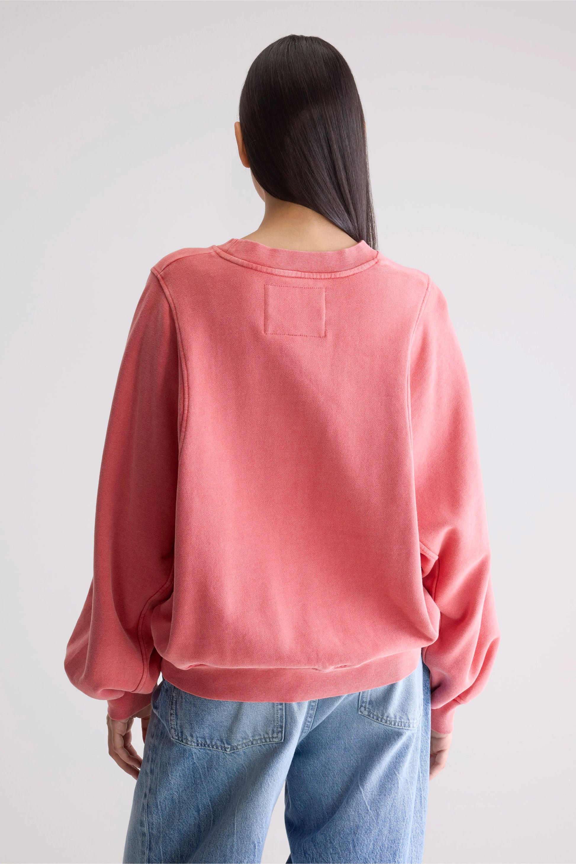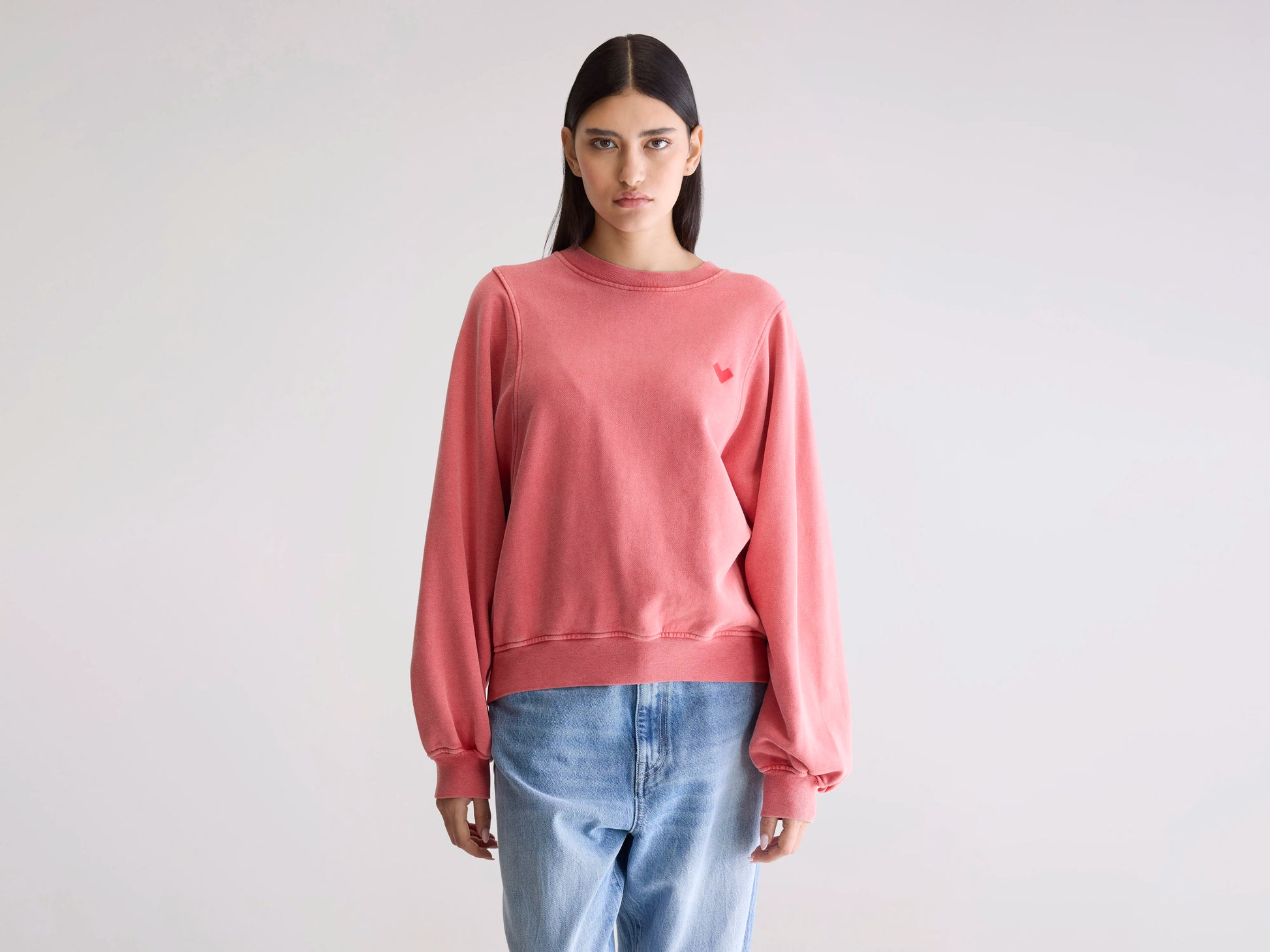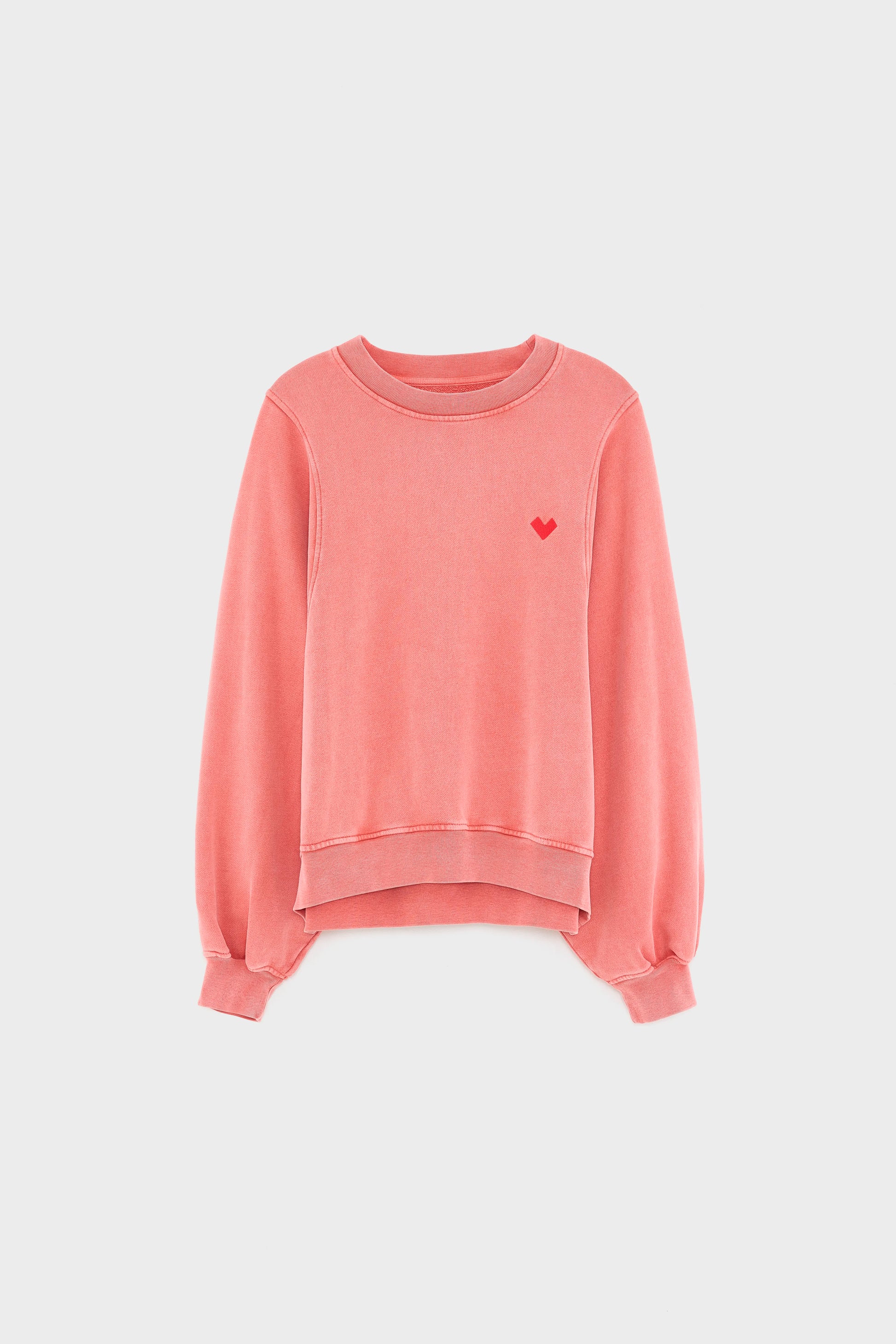 Washed pink oversized crewneck sweatshirt with curved seam details, featuring a tonal embroidered heart logo on the chest.