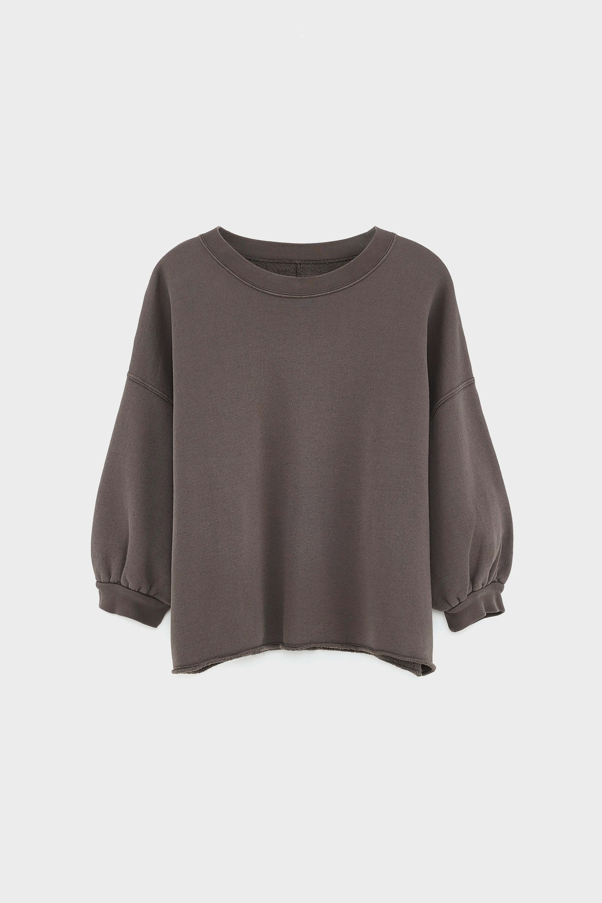 Relaxed crewneck sweatshirt in dark chocolate with raw-edge hem and 3/4 sleeves.